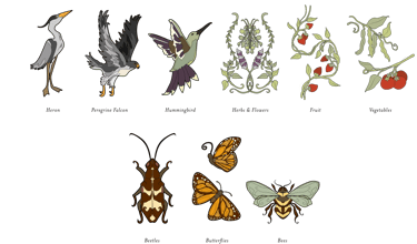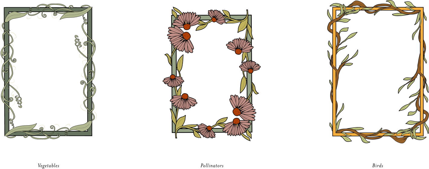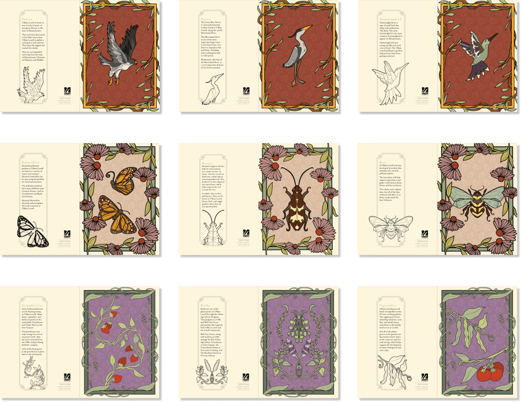 We created 9 images and 3 borders. They were based off of the different aspects of UML that makes our college sustainable and special. 3 birds, 3 plants, and 3 pollinators. Each set of 3 images was framed in a unique thematic border.