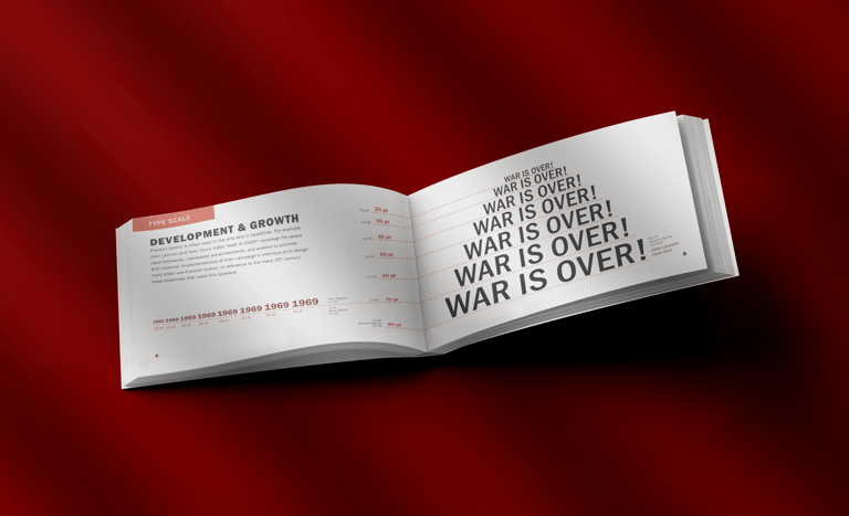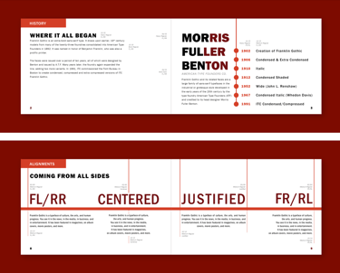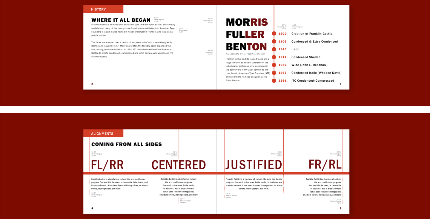 Communicating the feeling and history behind a typeface is important when creating a type specimen book. Franklin Gothic is a typeface that is used in culture, business, the arts, and societal progress. This book uses a modern and clean design with a classic red/black/white color palette to tell the story of how Franklin Gothic came to be, and why it is so influential.